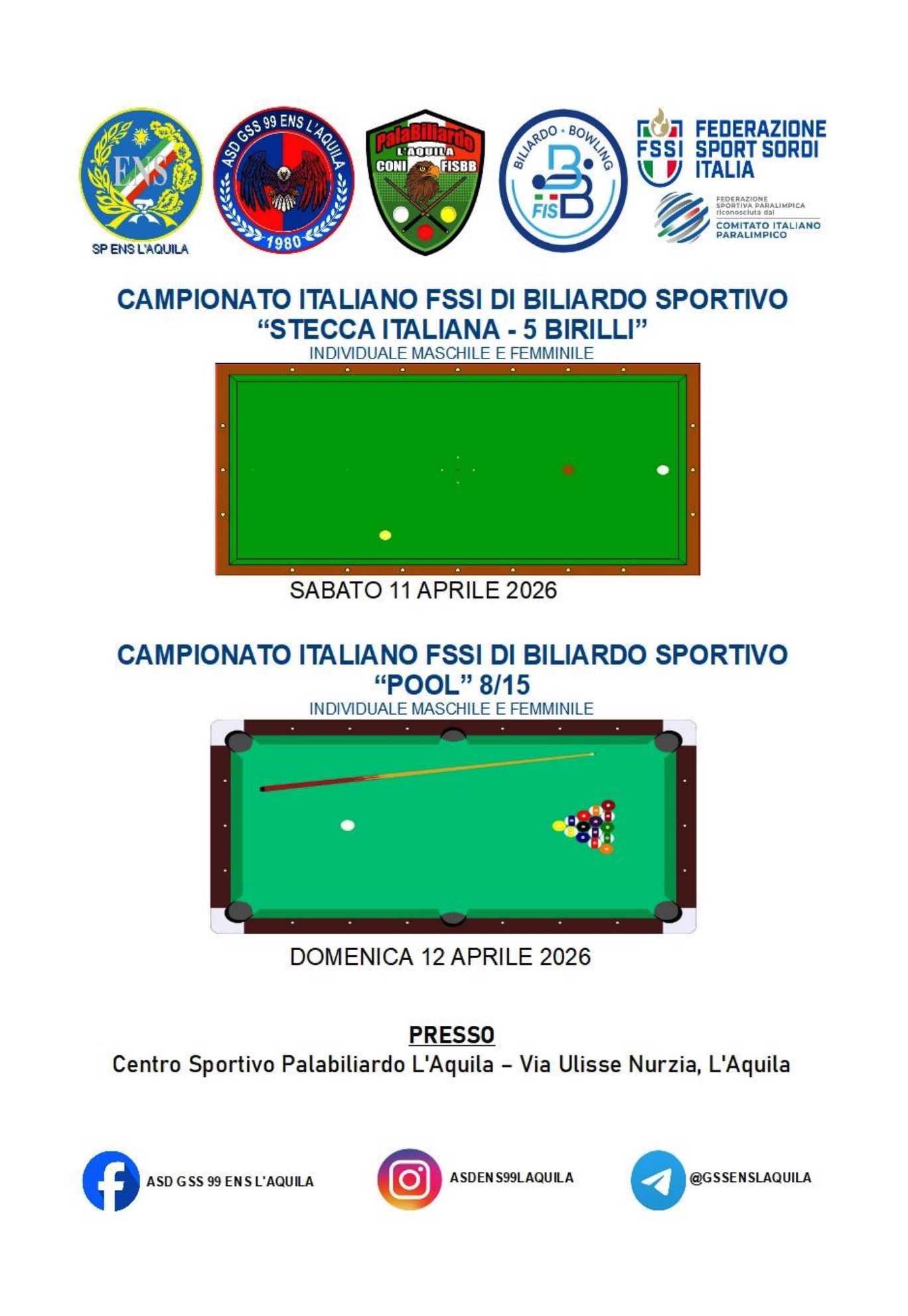L'Aquila L'AquilaLa Federazione Sport Sordi Italia organizza con la collaborazione dell’ASD GSS 99 ENS L'Aquila con l’assistenza della FISBB il giorno sabato 11 Aprile 2026 all' Aquila (AQ) il Campionato Italiano FSSI di Biliardo Sportivo Stecca Italiana “5 Birilli” per tutti gli atleti sordi. Programma Campionato Italiano Biliardo Sportivo Stecca e Pool 2026