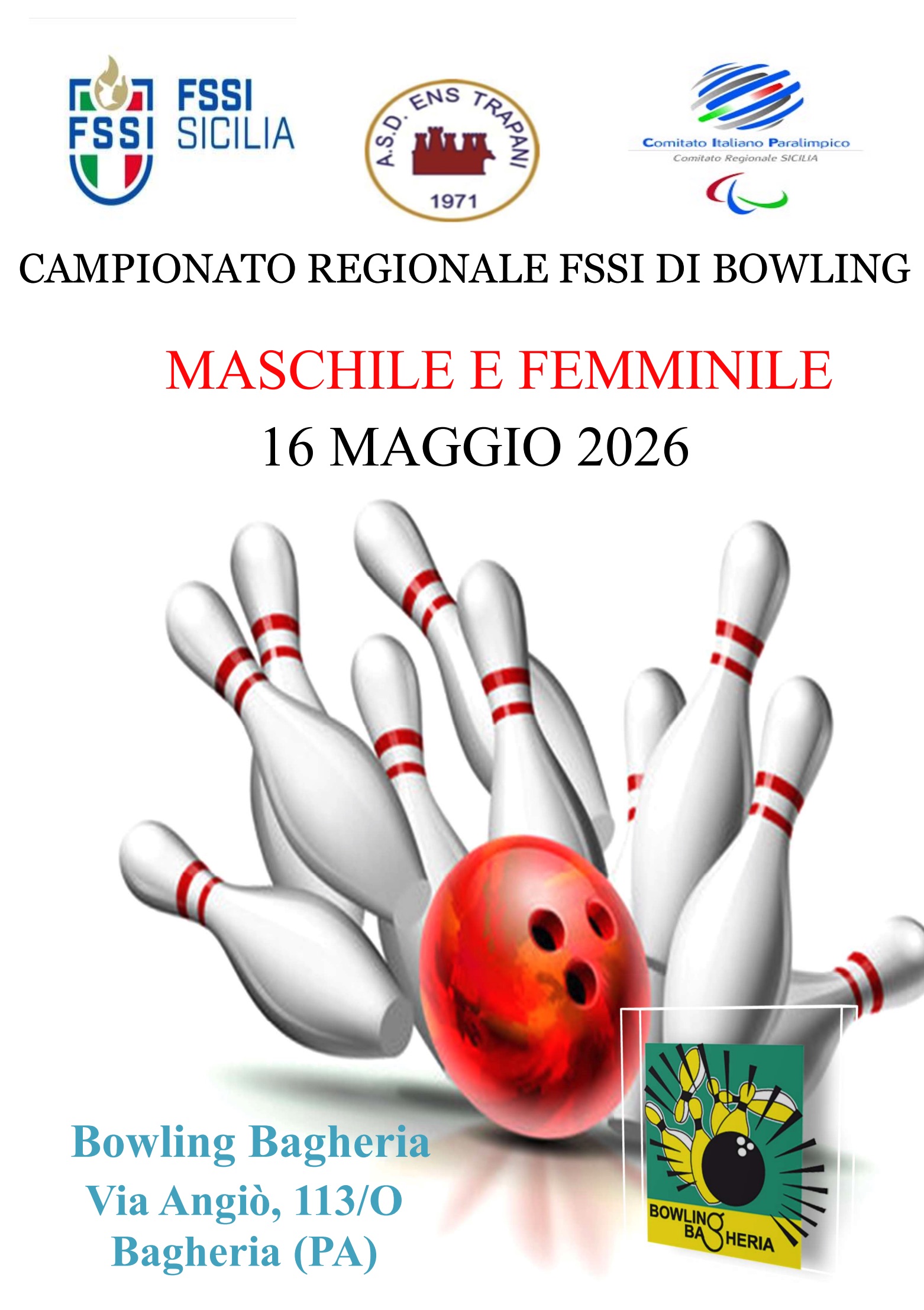 Bagheria Bagheria, ItaliaIl giorno 16 maggio 2026 si svolgerà presso il Bowling Bagheria, via Angiò, 113/O Bagheria (Pa), il Campionato Regionale FSSI di Bowling, “TRIS” Maschile e Femminile, approvato dal Delegato Regionale FSSI Sicilia e sotto la responsabilità̀ dell’ASD ENS Trapani. Programma Campionato Regionale Sicilia Bowling Tris 2026