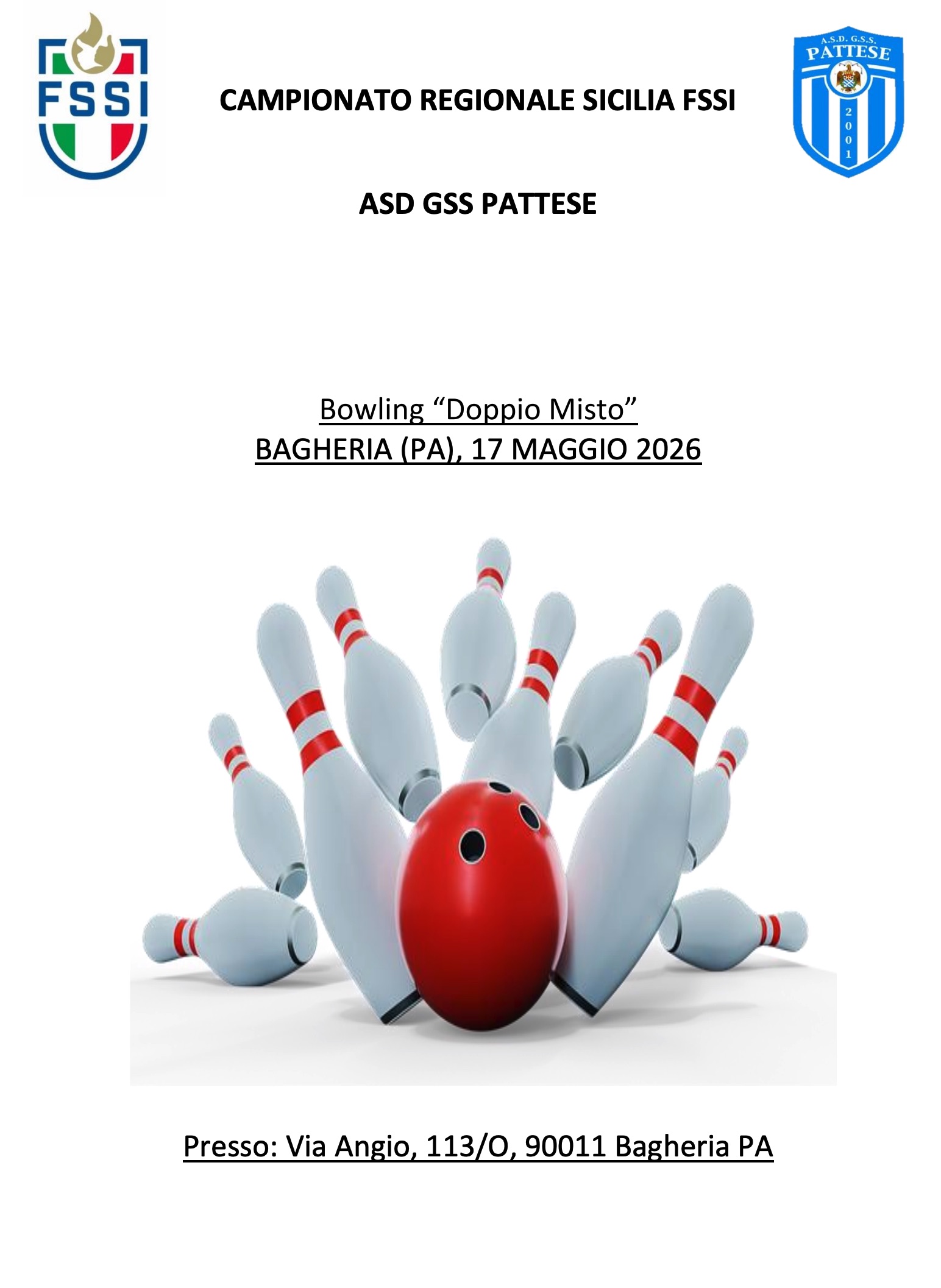 Bagheria Bagheria, ItaliaLa società ASD GSS PATTESE, in collaborazione con il Delegato Regionale Sicilia FSSI, organizza il Campionato Regionale di Bowling DOPPIO MISTO (maschile e femminile) a Bagheria (PA), presso il Bowling Bagheria, Via Angiò 113/O – Bagheria (PA), in data 17 Maggio 2026. Programma Campionato Regionale Sicilia Bowling Doppio Misto 2026