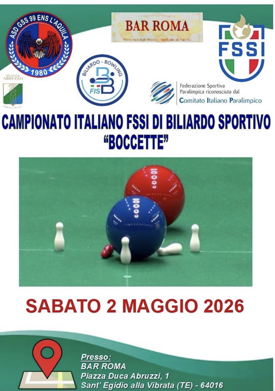 Sant'Egidio alla Vibrata Sant'Egidio alla Vibrata, ItaliaA.S.D. G.S.S.99 ENS L'Aquila e con l’assistenza tecnica della F.I.S.B.B. (Federazione Italiana Biliardo Sportivo e Bowling), il giorno 2 Maggio 2026, presso Bar Roma, Via Piazza Duca Abruzzi, 1 - […]