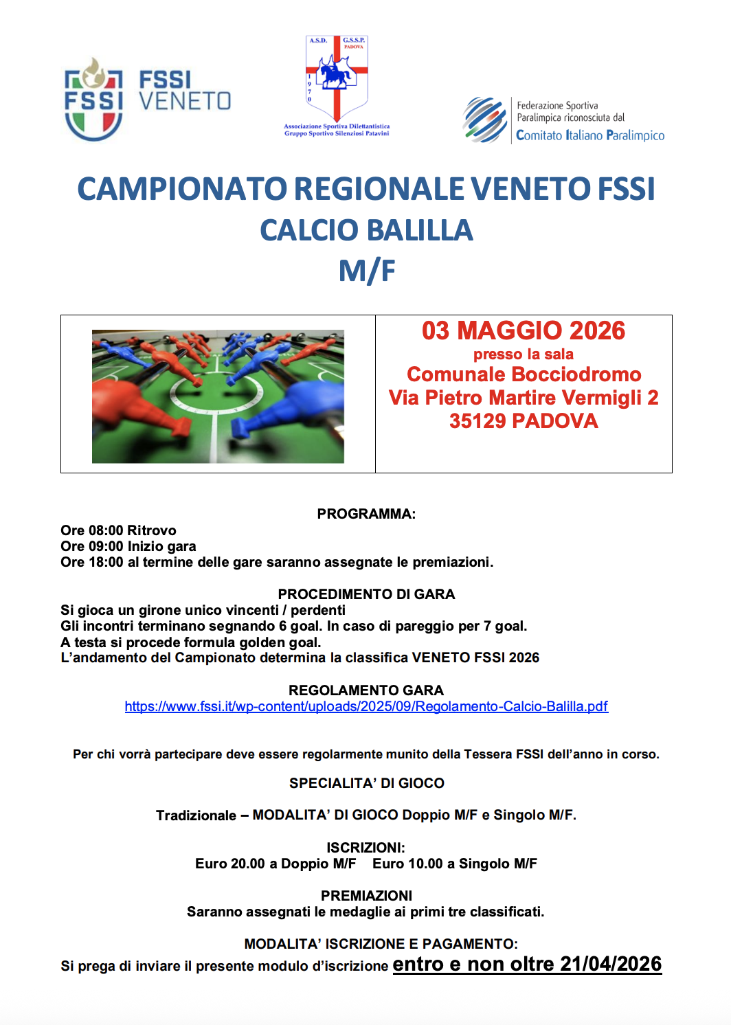 Padova Padova, ItaliaProgramma Campionato Regionale Veneto Calcio Balilla 2026