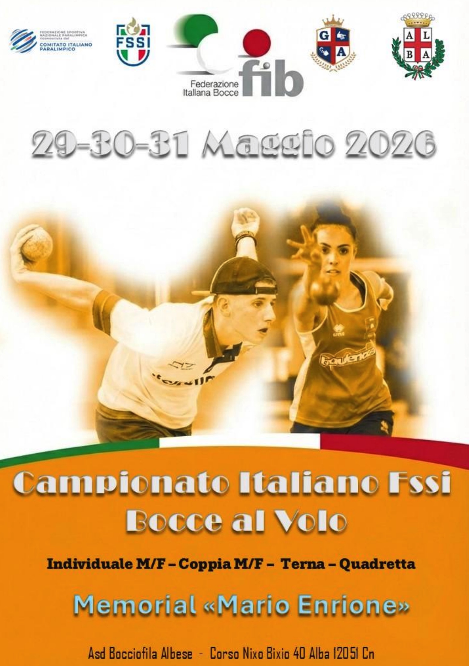 La FSSI organizza con la collaborazione dell’A.S.D. Gruppo Sportivo Sordi Alba e con l'assistenza tecnica della FIB nei giorni 28/29/30/31 maggio 2026, ad Alba Campionato Italiano FSSI Bocce Volo ASD la Bocciofila Albese Corso Nino Bixio 40 – Alba Programma Campionato Italiano Bocce Volo 2026 |