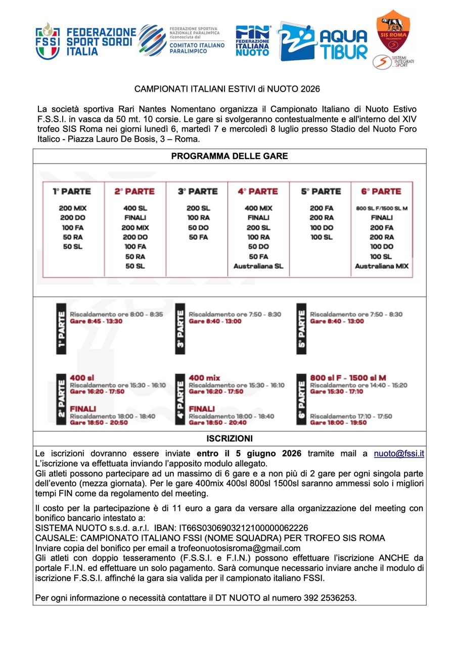 La società sportiva Rari Nantes Nomentano organizza il Campionato Italiano di Nuoto Estivo F.S.S.I. in vasca da 50 mt. 10 corsie. Le gare si svolgeranno contestualmente e all’interno del XIV trofeo SIS Roma nei giorni lunedì 6, martedì 7 e mercoledì 8 luglio presso Stadio del Nuoto Foro Italico – Piazza Lauro De Bosis, 3 – Roma.