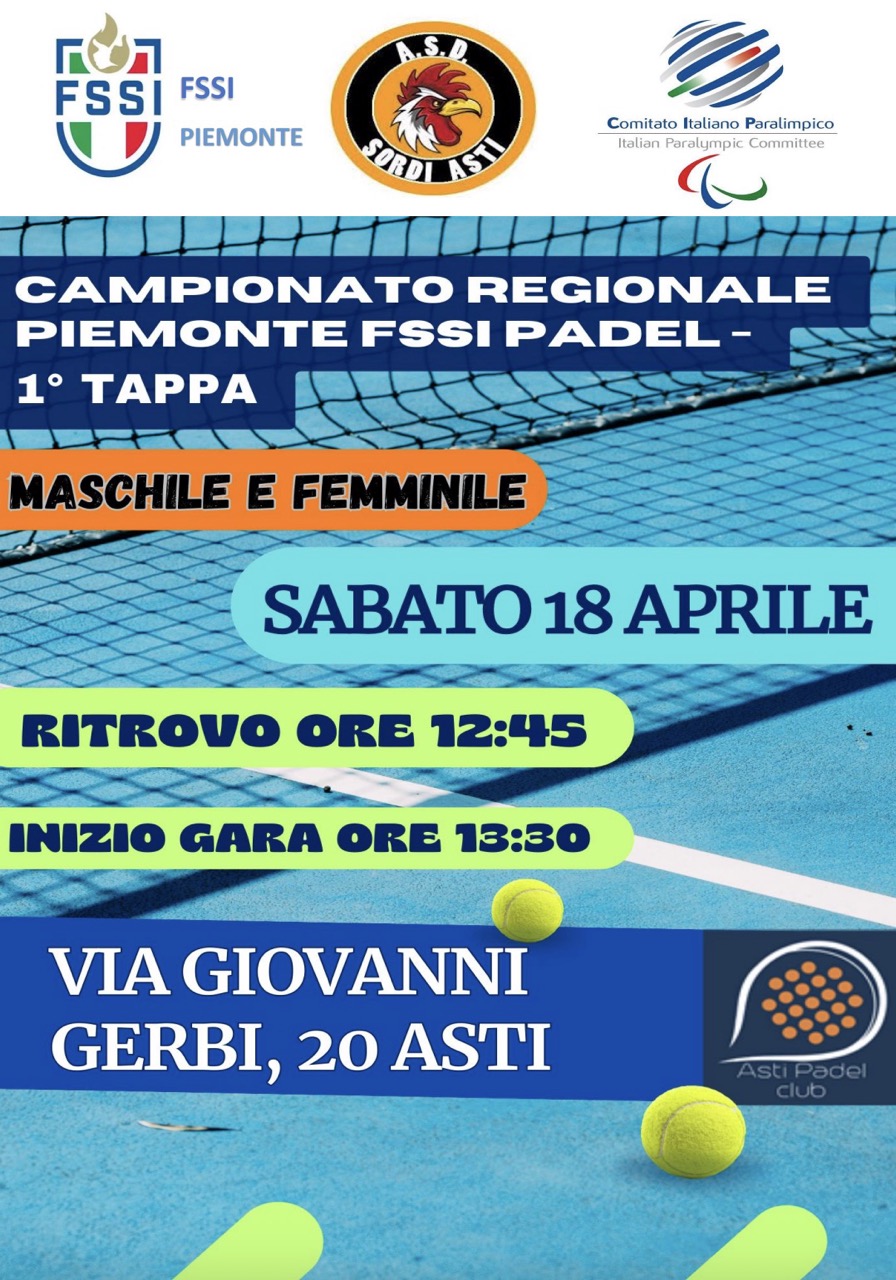 Nel giorno 18 aprile 2026 ASD Sordi Asti organizza con la collaborazione della FSSI Piemonte la prima tappa del campionato Regionale Piemonte FSSI Padel. La partecipazione è riservata a tutti gli atleti di categoria regolarmente tesserati dalla FSSI per la stagione agonistica 2025/2026. Programma Campionato Regionale Piemonte Padel 1 tappa 2026