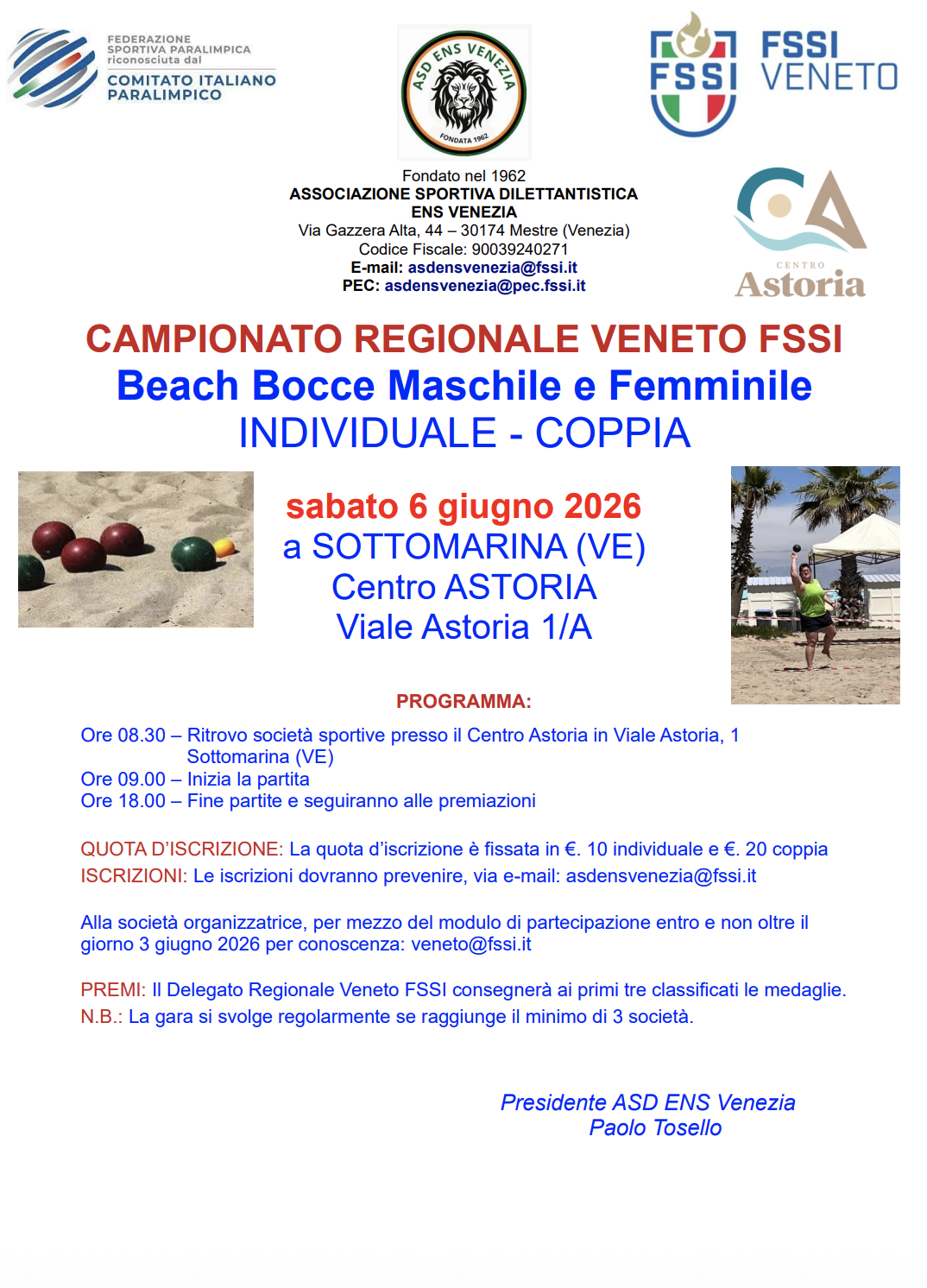 BEACH BOCCE – Veneto Giugno 6 Sottomarina (VE) Sottomarina Chioggia (VE), Italia Programma Campionato Regionale Veneto Beach Bocce 2026