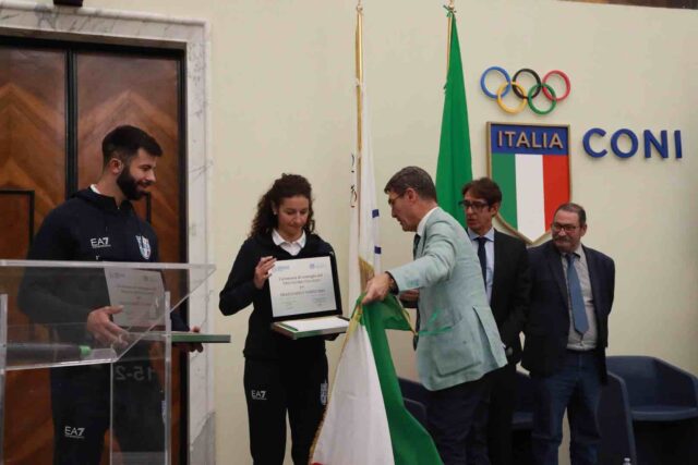 Nel corso della conferenza, in un momento particolarmente solenne, sono state consegnate le Bandiere ai due Portabandiera, la capitana della squadra di pallavolo sorde, Ilaria Galbusera e il giavellottista Matteo Masetti.
